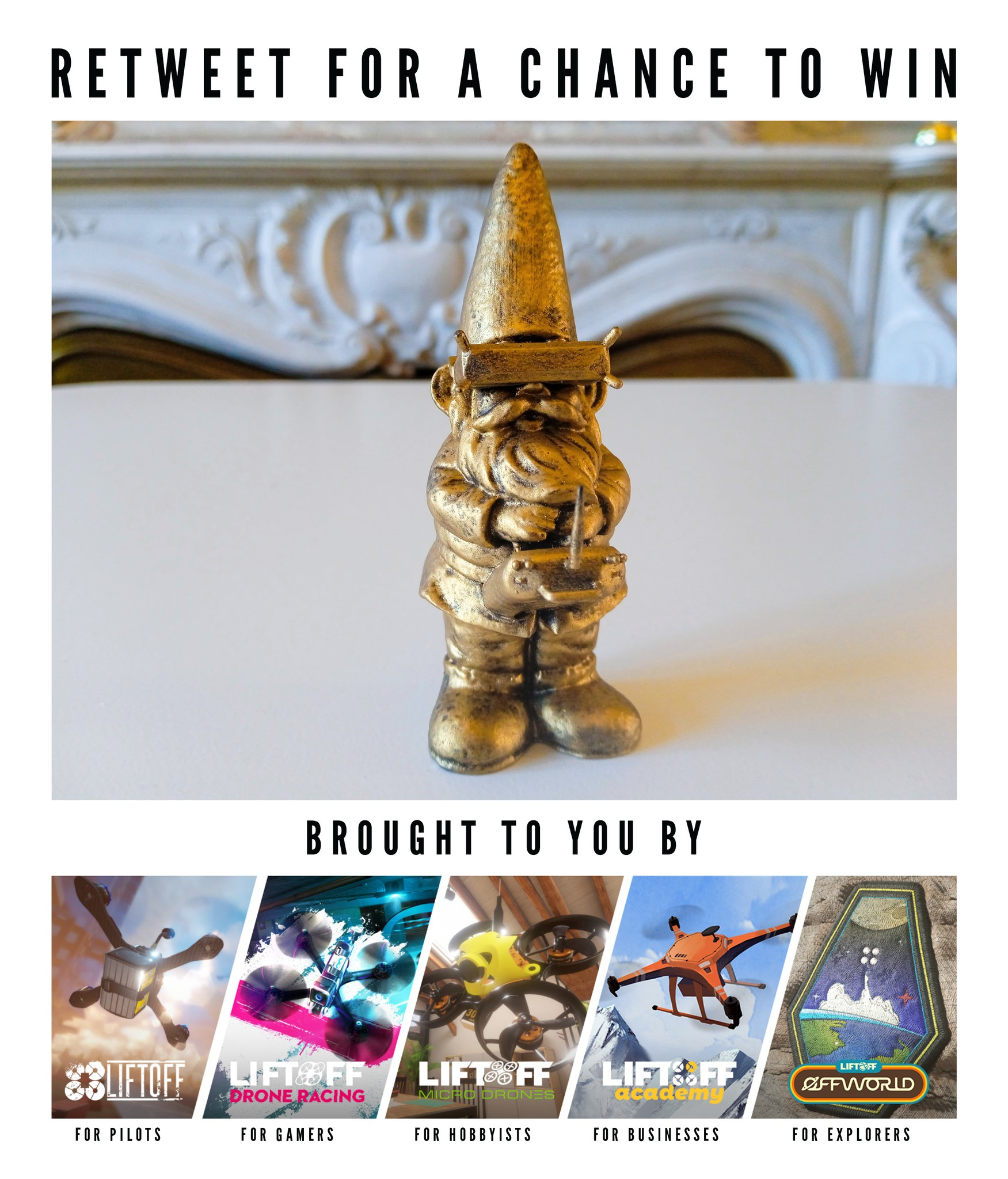Those who have explored the Liftoff: Micro Drones levels In great detail might have found the occasional hidden FPV gnomes in each level. Now you can win a real life FPV Gnome and all you have to do is follow us on Twitter and retweet our contest tweet that's it!.