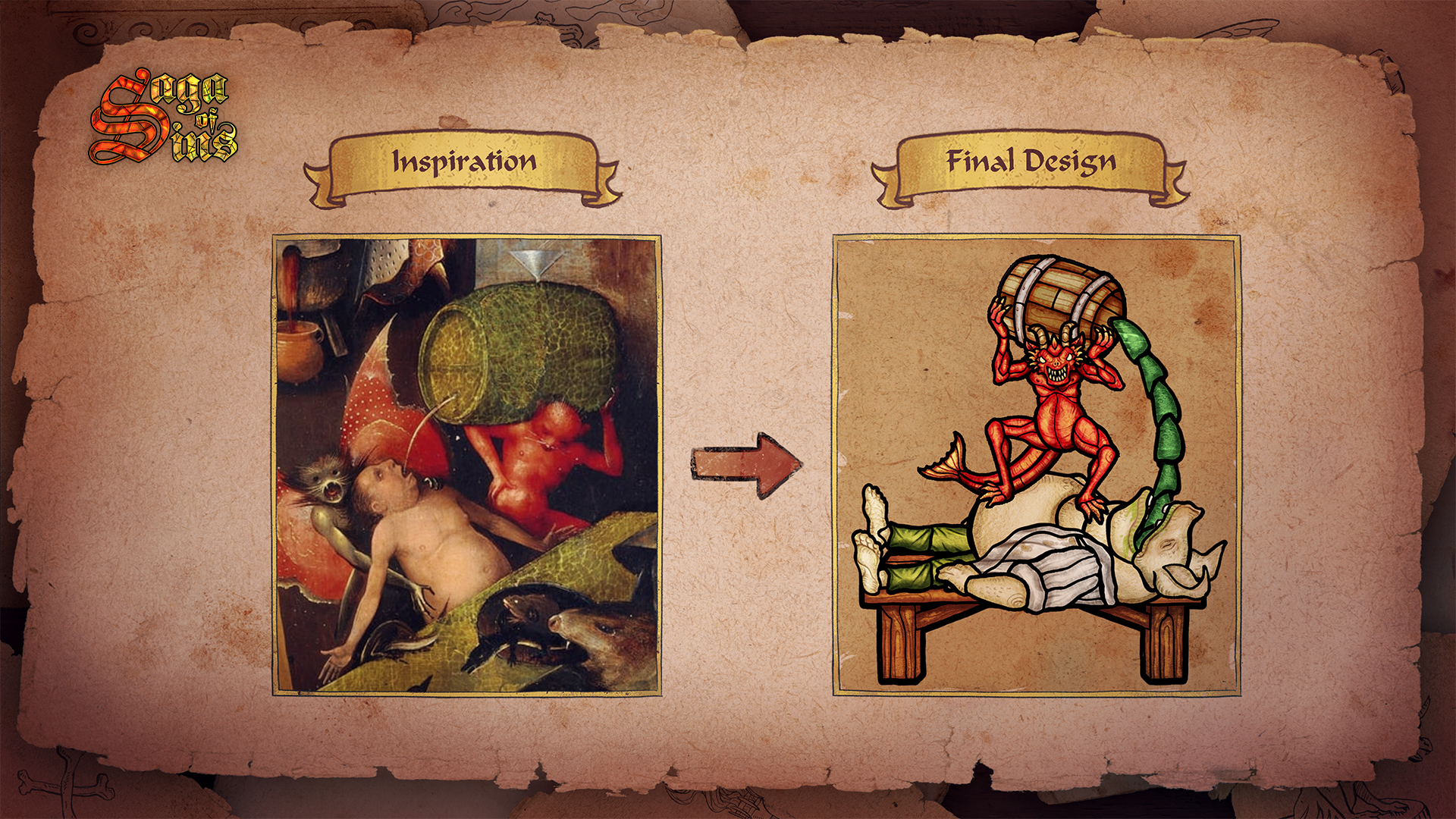 As you can see above, Gluttony manifested itself in the minds of the according sinners as a medieval tavern gone wild! Humans turned into feasting pigs, little devils are swinging on chandeliers dropping toxic liquid and the innkeepers are throwing around barrels of beverages. The idea of a red devil tormenting a pig by pouring acid in its mouth is actually inspired by the amazing triptych “Last Judgment” by Hieronymus Bosch, that was created around 1485.