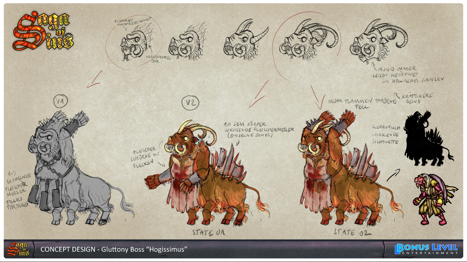 A mad, giant hog with dozens of knives in his back tossing burning barrels at you? Please say “Hail fellow, well met.” to our very first boss in Saga of Sins!