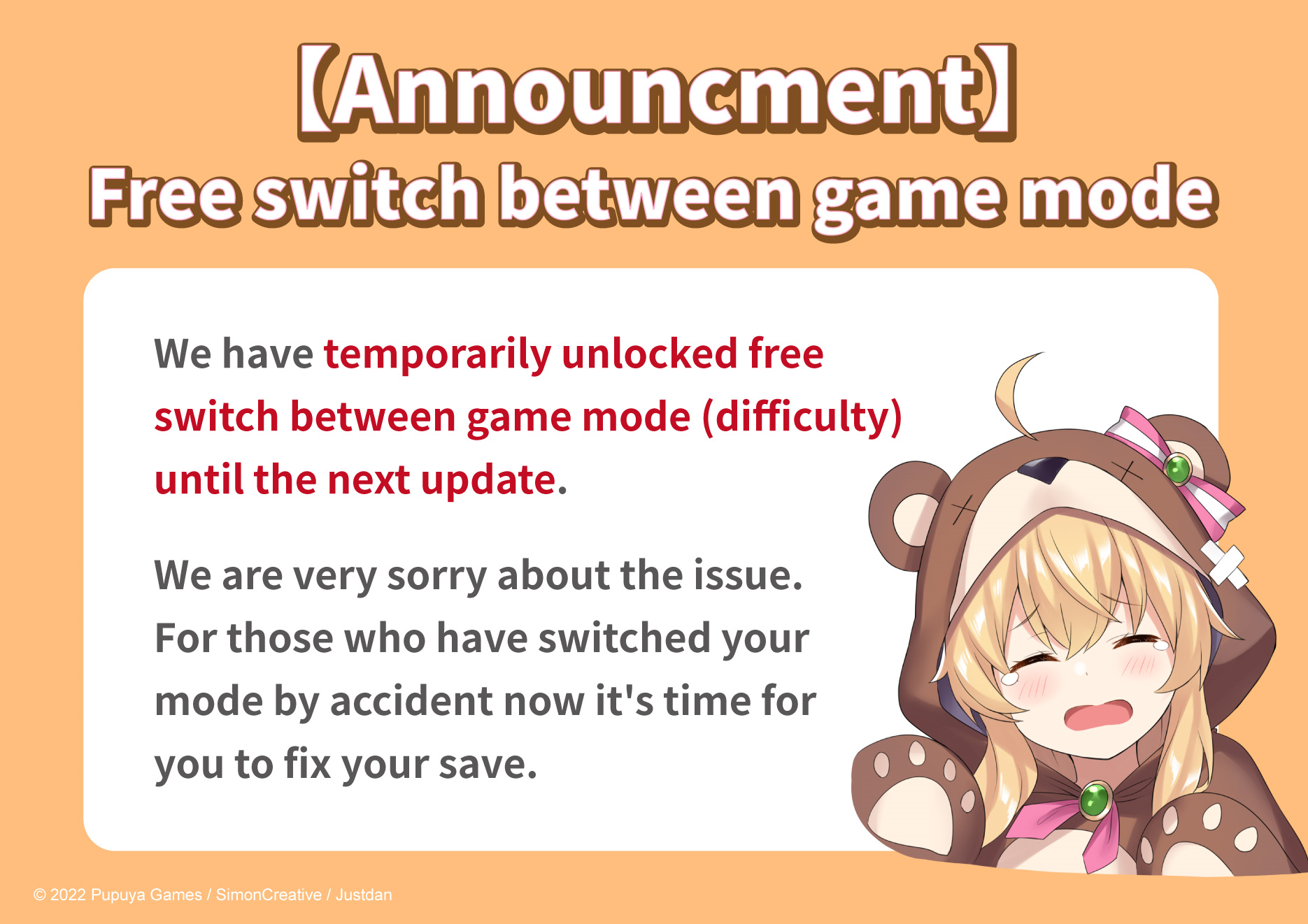 We have temporarily unlocked free switch between game mode (difficulty) until the next update. We are very sorry about the issue. For those who have switched your mode by accident now it's time for you to fix your save.