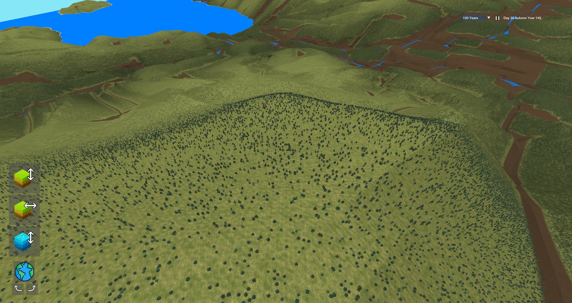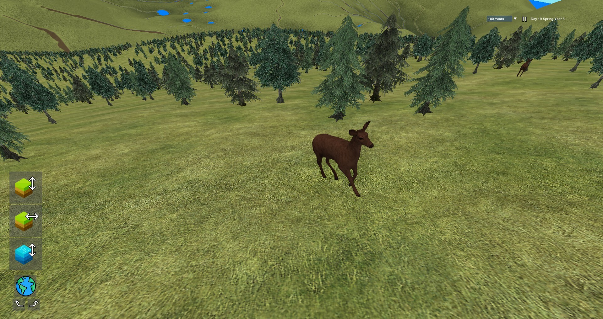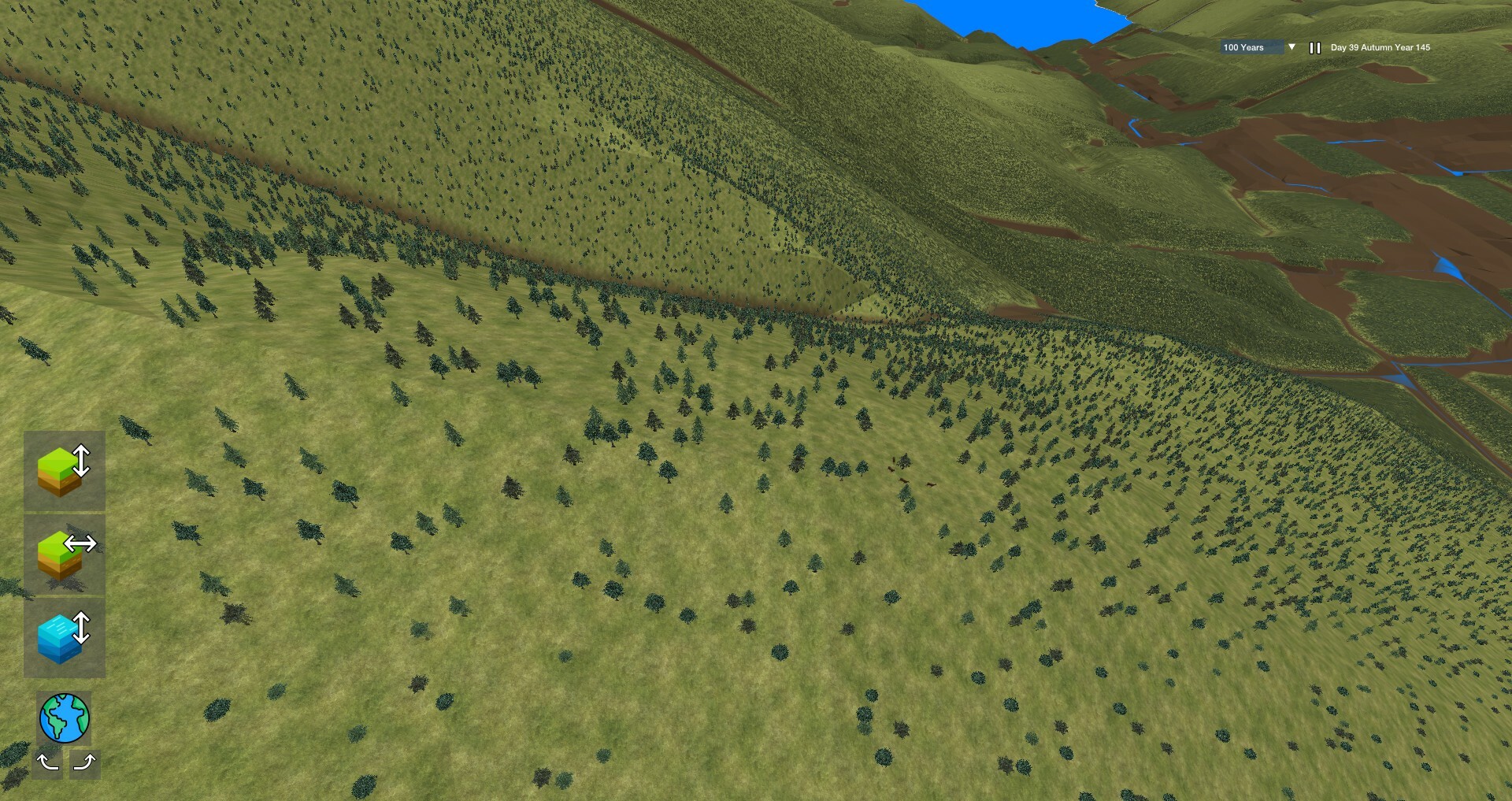 The most important change is to the camera system. The current camera uses an orthographic projection, which makes everything the same size no matter how far away from the camera it is. The camera scale is changed as you zoom in and out, but there is no perspective- if you look downhill the trees at the bottom will be the same size as those far away. You can actually crash or vastly slow the game by looking downhill at the wrong angle and overloading the level of detail that is rendered. An orthographic camera makes a bunch of things about moving and zooming the camera easier but adding animals required a lot more care for how the game looks at close zoom levels, so it had to go. We now have a proper perspective camera with varying levels of detail depending on how far away things are, and smooth transitions in between. There is a lot of complexity behind this and it's been the majority of the work since the first release.