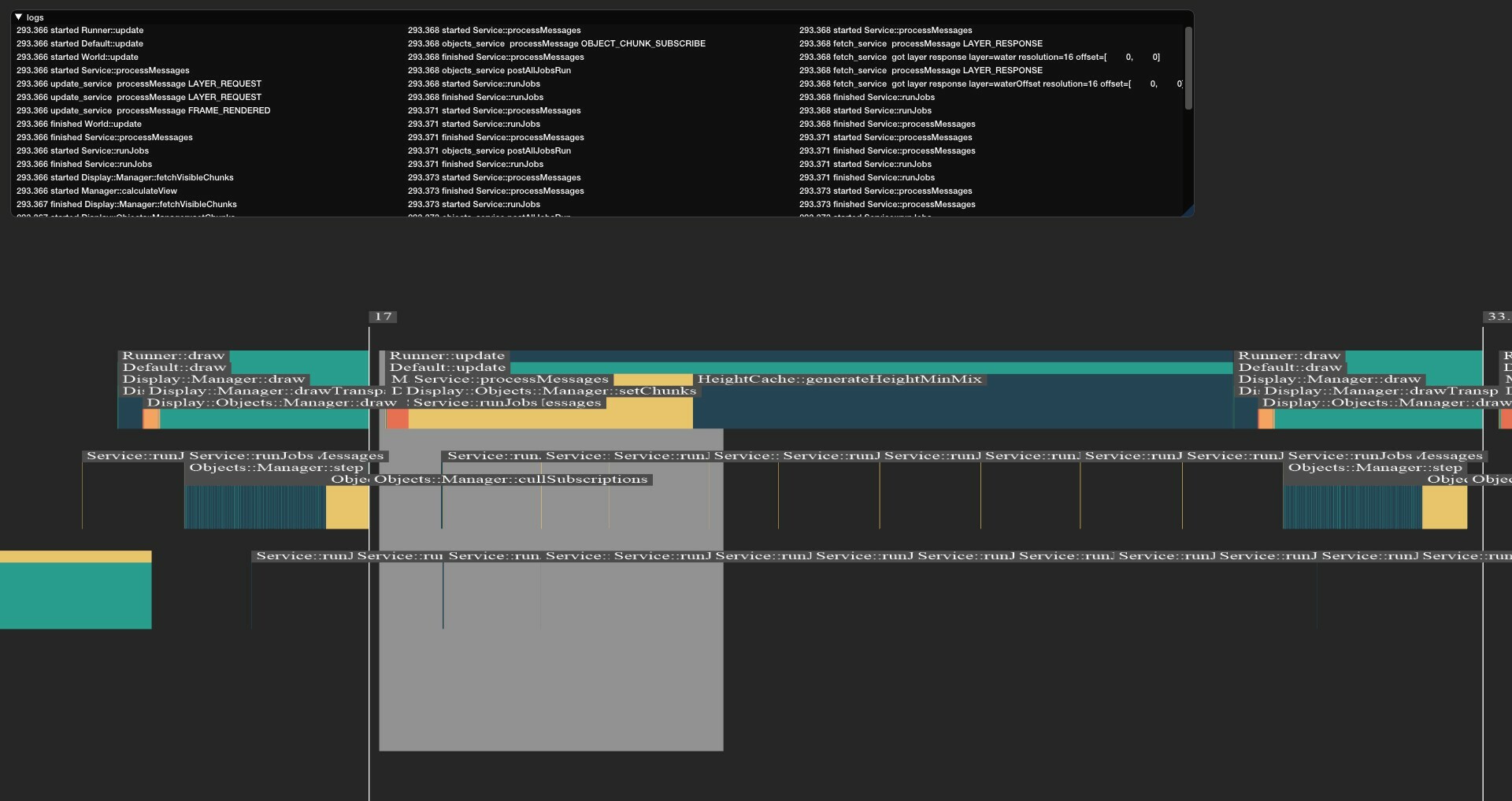 A lot of work has been put into changing how the world updates. Whereas previously everything was running on a single thread, a whole new system to update the world using multiple parallel threads is now implemented. This will allow the game to smoothly generate and update loads of animals, befitting the scale of the game where you can zoom from kilometers in to individual trees. There are alternate debug views in game to monitor what the threads are doing, how they are communicating and how quickly the game is rendering to get as close to smooth 60fps as we can.