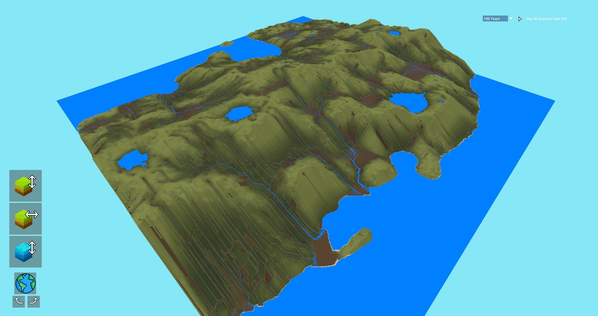 Finally what all this has been working towards: being able to see creatures running around! This has been the focus since the first update as it really adds an extra dimension to playing around with the simulation. Already there are effectively different biomes such as forests, plains, swamps, rivers, lakes, the shore and ocean but there is very little to distinguish them. The different biomes will be inhabited by different animals giving you more reason to experiment with the landscape and will make coming features such as variable rainfall, variable temperature, snow and ice a lot more impactful.