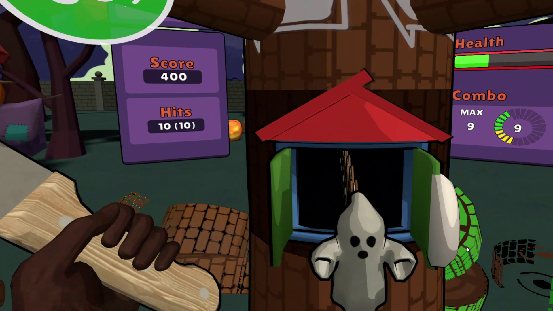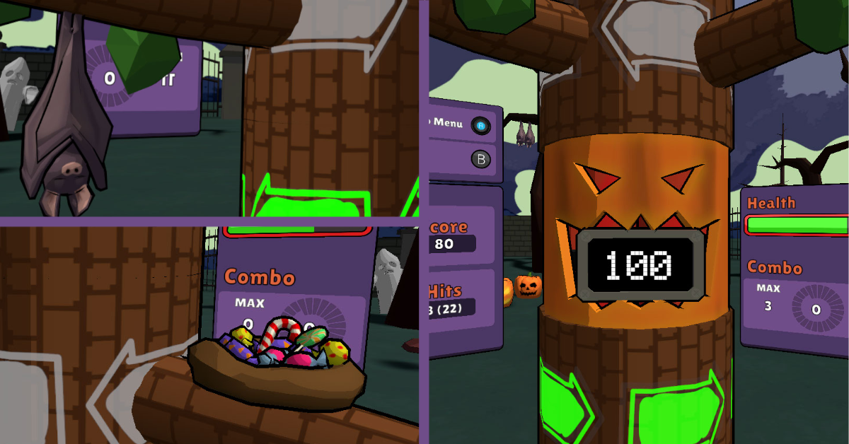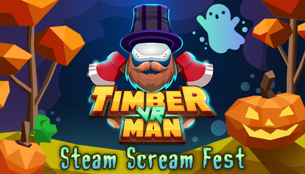 "pumpkins, candles, and even a cauldron witch squirrels, a bat axe, on my shoulder a pauldron to make the game more fun, the ghost is in the clock Timberman VR Scream Fest is on, just knock, knock, knock"