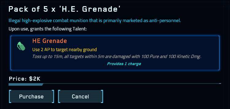 It has been needed for a long time -- and we're in a mode of cleaning house on these types of things -- grenades have been nerfed. Where before they functioned as a one-dimensional get-out-of-jail-free kill the entire reinforcing enemy squad kind of thing, they are now more powerful but with a lot of room to be more interesting. Damage has gone down -- HE Grenades cause a good chunk of Pure Damage and are best for armored targets while Frag Grenades cause more Kinetic Damage in a larger radius and are better for less armored targets.