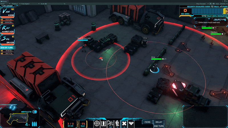 Third, we've changed two important rotation rules for enemies. When an enemy is attacked, they will rotated toward the point of attack. This may mean that they see you, depending on some factors such as the range of the weapon you used. This is generally going to help AI who survive stealth attacks take more intelligent actions on their next Turn. And the second rotation rule is around Suspicious enemies. A bug had crept into the AI thinking, that once an AI was Suspicious, they no longer needed to rotate to hear new sound events (lure, sneaking, running). This made sneaking up on Suspicious enemies silly easy. Suspicious enemies now rotate toward sounds they hear and will rotate toward footsteps up to twice (when they first hear and when the movement ends if it is in their hearing range) per movement. This also adds the nuance that multiple Lures can be used on enemies again either on the same Turn or across multiple Turns.