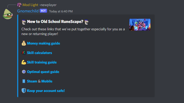 Typing ‘-newplayer’ will command the Gnomechild bot to send you helpful guides, like this: