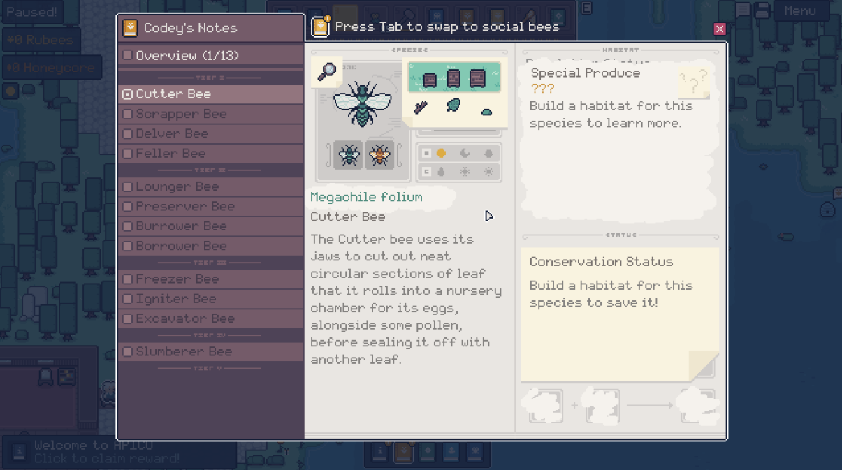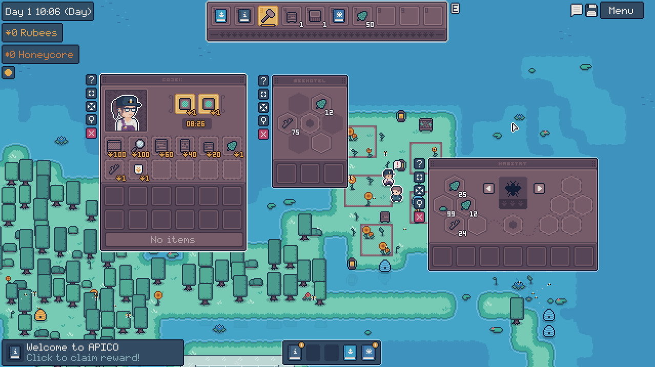 This update consists of early-mid content - you will be able to use your existing save! Things to look forward to include: - New NPCs! Meet new friends Codey & Sto, research partners from the Mainland (!) - Butterflies! Beeautiful flapping friends to find and discover - Solitary Bees! Bees that don’t work in hives but live alone?? - New Flowers! More fancy flowers, each with their own new effects on the environment! - More books! We know you love reading, otherwise why are you playing APICO? <3 - Improved Dialogue System! Now you won’t miss all the wonderful writing Jamie has done, plus some new dialogue! - Incense! Finally you can make candles, plus your own incense through the magic of Alchemy! - More Music! The wonderful bee-sides by Mothense have been added <3 - More decoration! Lots more decoration items, tiles, walls and more! - More achievements! 16 more delicious achievements to get hold of! - Loads more freakin’ bugs I am sure because I am just one person!!! :D
