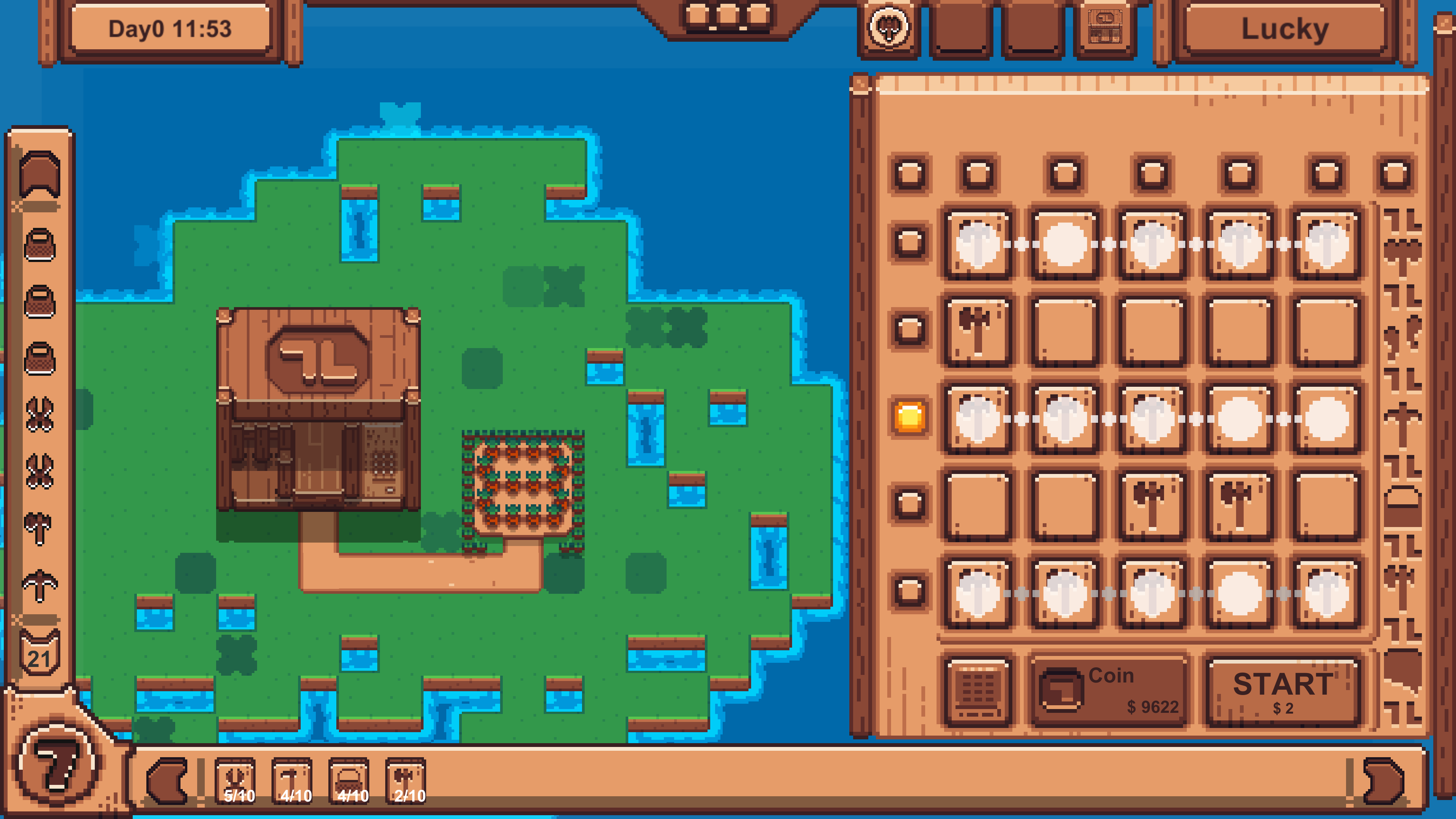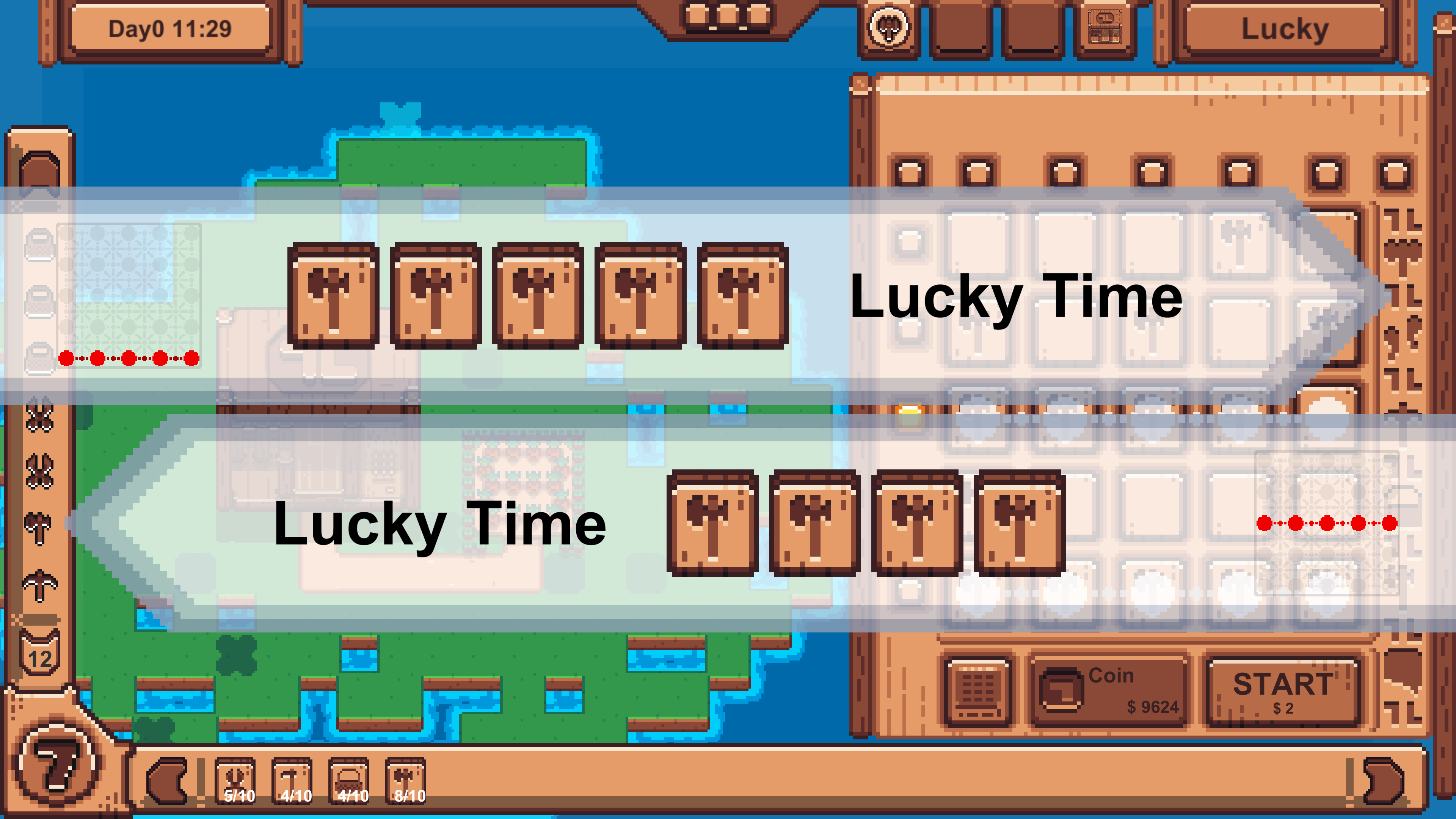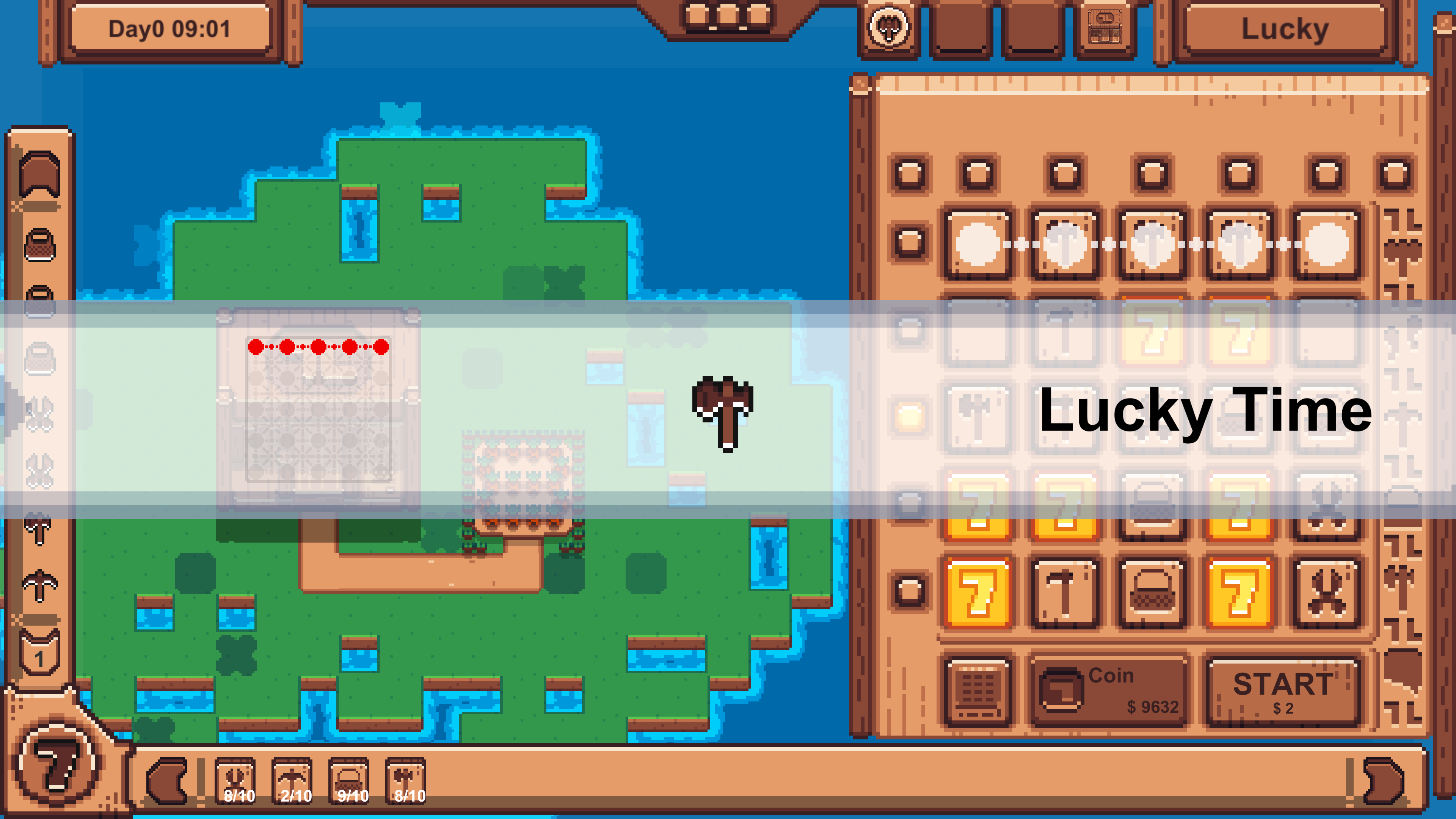 Development progress There are currently three types of slot machine blocks, function blocks, lucky blocks, and tool blocks. Every time playing the slot machine, there will be three different effects appearing in sequence according to the type of blocks. The function block will directly affect the slot machine result, and the effect will occur immediately after the slot machine stops. Lucky block will have special effects, and normal lucky block will trigger the effect after connecting. The primary function of tool block line connection will directly obtain the tool, and the line connection effect and the tool data have been linked . Automatic sorting function has been added to the bag.