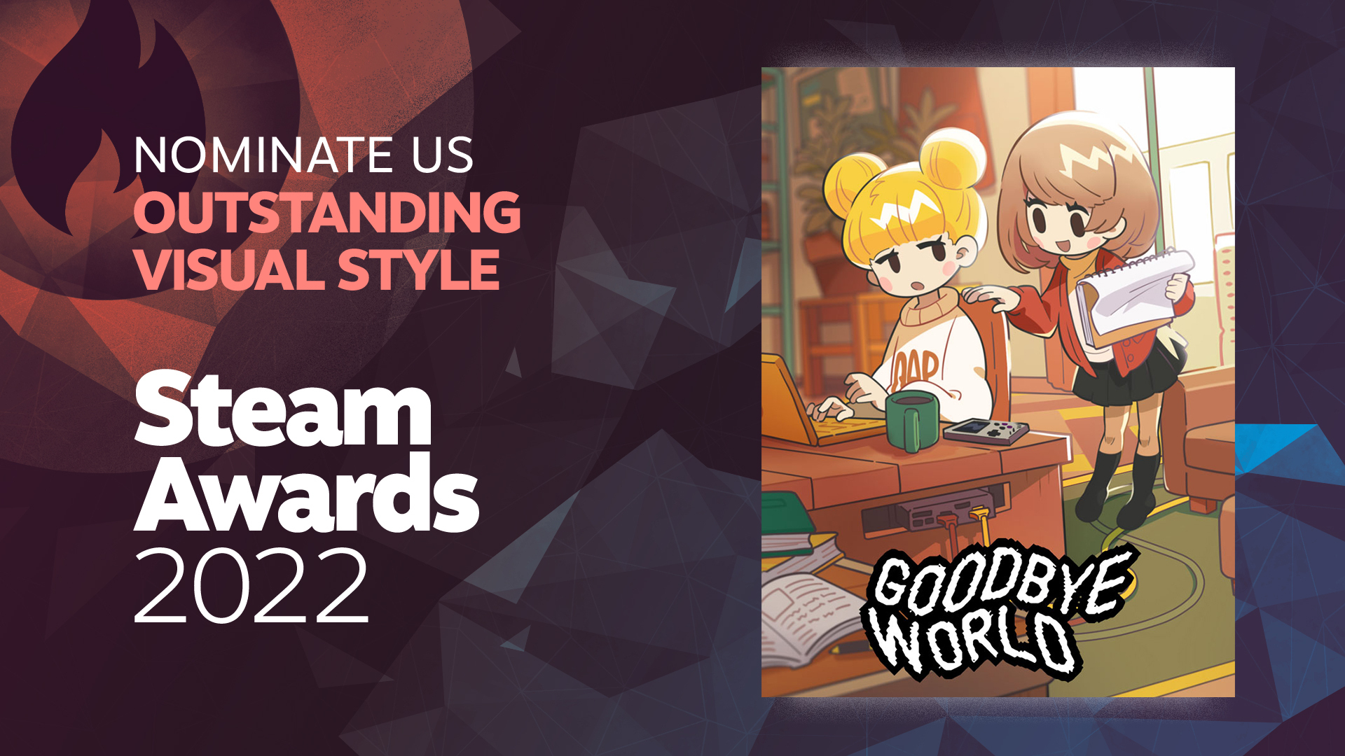 If you liked the game, [h5]please give GOODBYE WORLD your vote for Steam Awards 2022![/h5]