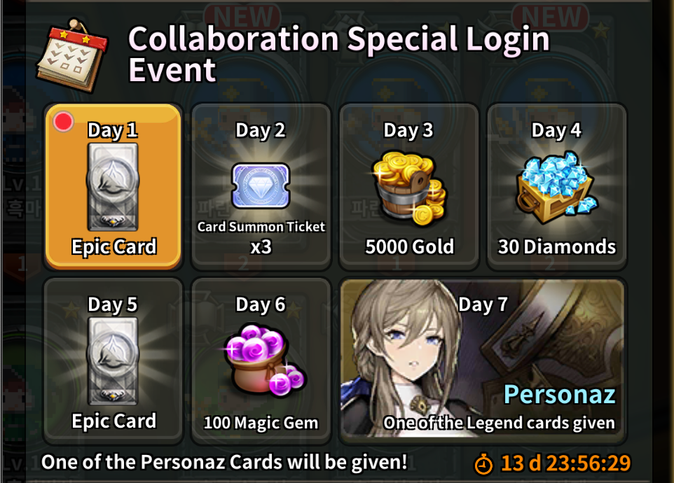 ◆ The Personaz Card Gift EventTo celebrate the collaboration with Brave Nine, the Card Gift Event will be held. One of the Personaz cards can be obtained when you log in during the event period. ▶ Login reward obtainment period: November 24th (after the update) ~ December 29th ▶ Event period: 14 days after the first obtainment ※ If the previous Login Event is ongoing, the Login Event will be open after receiving all the rewards from the previous login event.