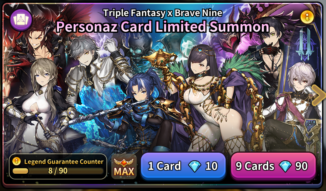 Triple Fantasy and Brave Nine have prepared a special collaboration event! Meet the Liberator’s Apostle, and the Personaz cards in the [Triple Fantasy X Brave Nine] Personaz Pick-Up Limited Summon!