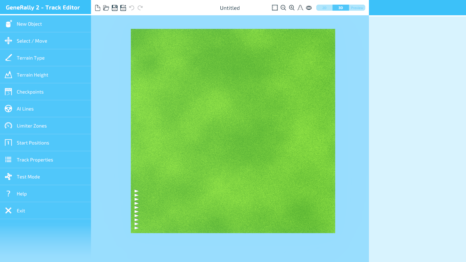As a veteran of GeneRally 1, the first thing to notice is that the Editor is accessible straight from the game menu. When going to the Editor, we're greeted with the oh-so-familiar empty grass map. While I love the early 2000s style GR1 TE user interface after all the years I've spent with it, it's great to have a modern UI!