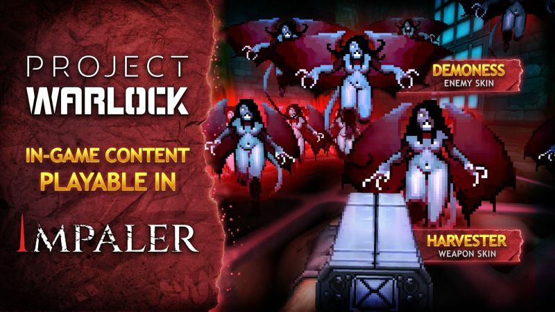 Upon the release of Impaler on December 6, the game will include in-game enemy and weapon skins from Project Warlock. The sexy Demoness will invade our cathedral and the powerful Harvester shotgun will be there to stop her from sucking out your life!