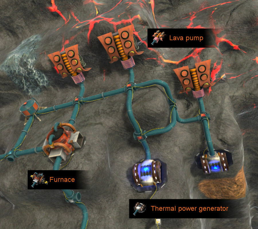 New buildings based on nickel technology tree: Lava pump, thermal power generator and furnace.