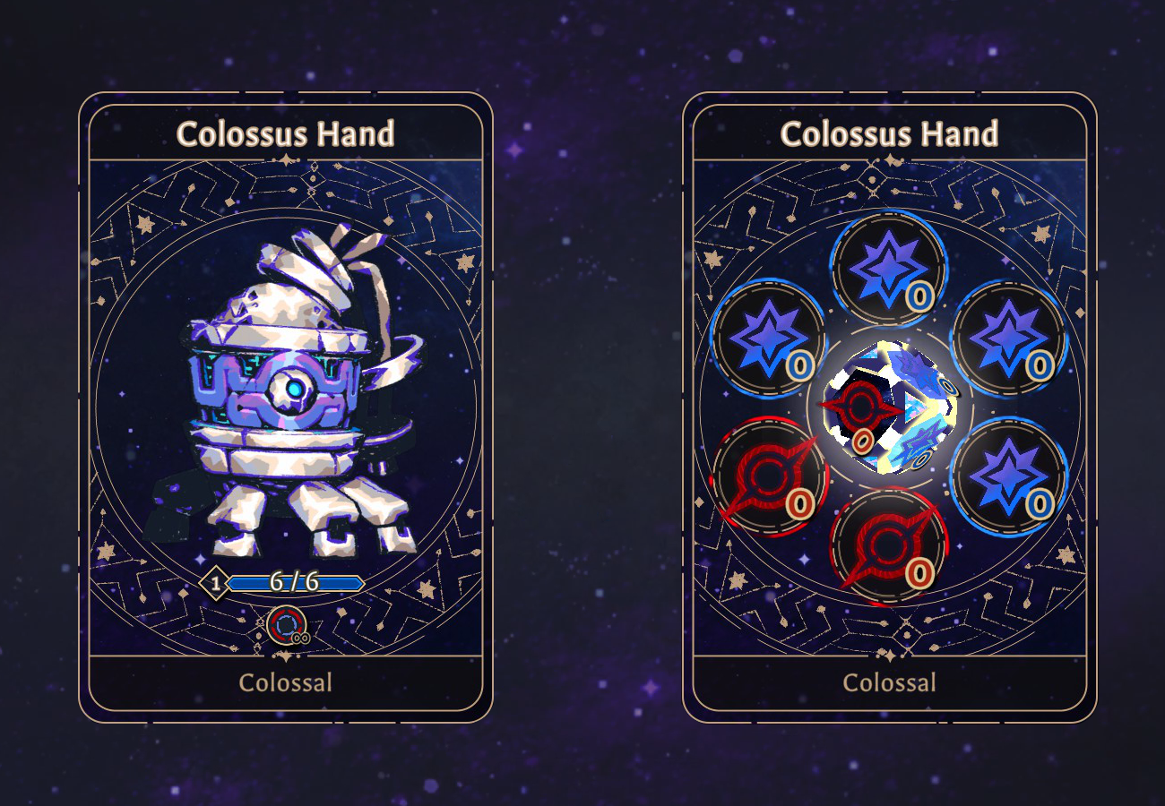 Colossus Hand is a die with 2 corruption faces and 4 purify faces. Each corruption and purify face can be a random 1 to 6 in power and will change every time you draw the die. So the best you can roll is 6 purify and the worse you can roll is 6 corruption.