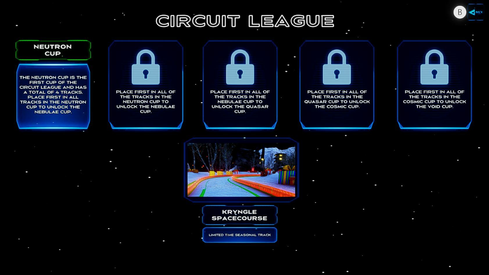 - NEW TRACK: Kryngle Spacecourse - Limited Time Seasonal TRACK - Added the Circuit League and Cups to the game - Tracks are now split into Leagues and Cups in Single Player - UI changes - new UI for Cups and seasonal theme for main menu - Added Speed Boost Orbs to every track - Altered some Post Processing settings - Changed the placement of Credit Orbs on most tracks - Removed the Card Collectibles System - Reset Leaderboards due to the addition of Speed Boost Orbs - Reset Progression due to introduction of Leagues and Cups - This will hopefully be the only progression wipe until full release (only if necessary at release) - Removed the Card Collectibles System