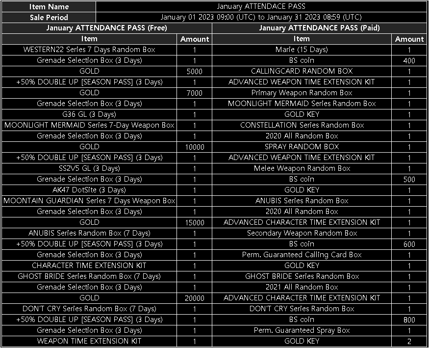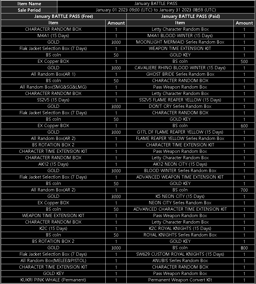 1. January Season Pass Specials ▶ Period: January 1st, 2023 00:00 ~ January 31st, 2023 00:00 (UTC Time Zone) ▶ Premium Battle Pass final rewards change only for January Season Pass. - General Battle Pass 40-level reward: KUKRI PINK WHALE (Permanent) - Premium Battle Pass 40-level reward: Permanent Weapon Convert Kit X1