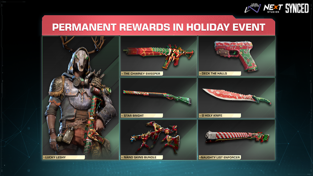 Our seasonal event is still live until Jan 6, and there are a range of weird and wonderful rewards to scoop up before it finishes. Remember, Holiday rewards are permanent (meaning they will be valid in the full release of SYNCED too) so this is an opportunity you don't want to miss!