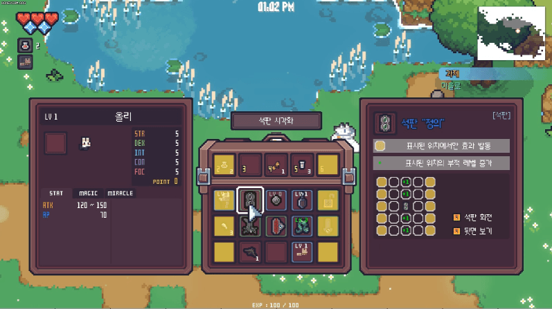 To add a bit more explanation, This is an inventory in Sephiria. "Charms" and "Stont Tablets" are main items in the game. Placing a stone tablet near a charm will strengthen a charm. To get more stronger, you need to handle your inventory well.