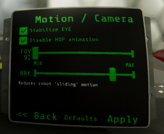The new BRK ('brake') slider enables you to reduce the 'slidey robot' behaviour. We'd prefer you to try to adapt your brain to the slidey motion, since it comprises much of the 'feel' of being the different robots - but if the motion is doing your head / stomach in... you can now reduce or eliminate it entirely by adjusting your BRK.
