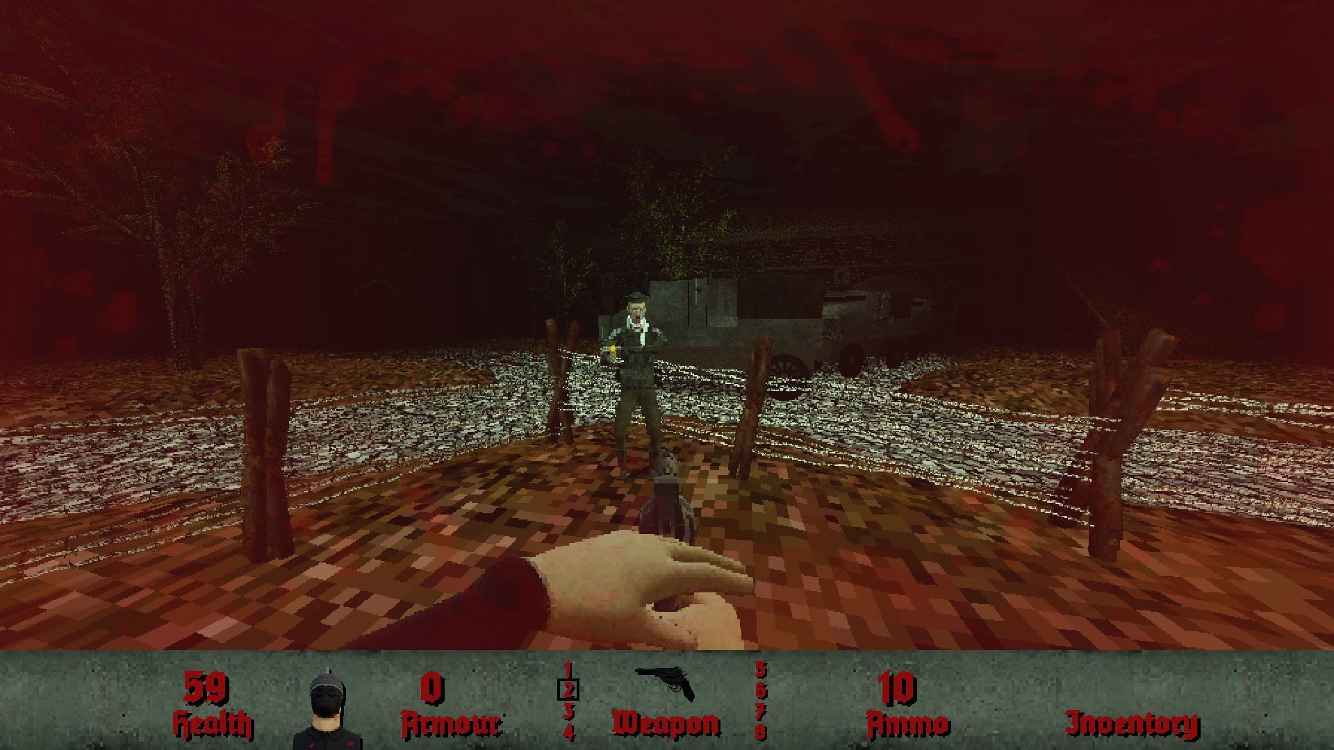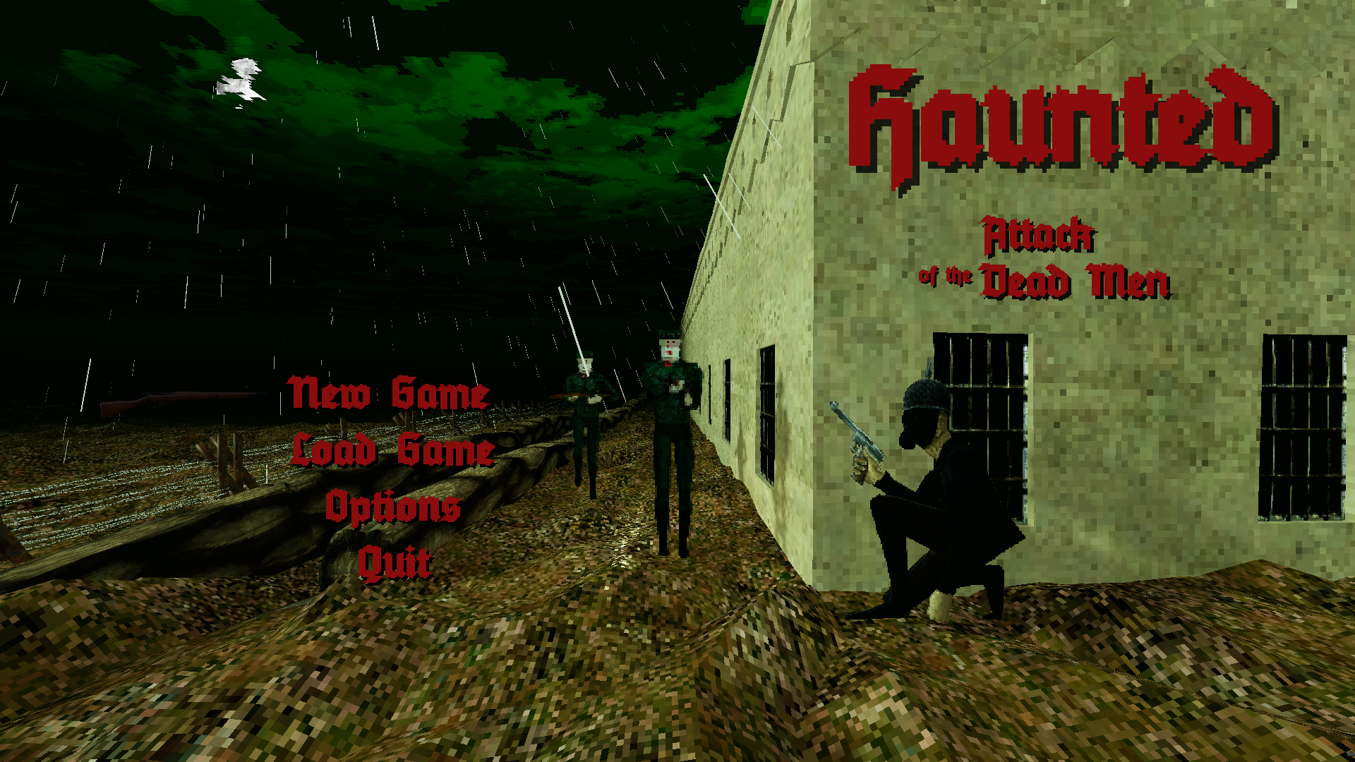 2022 has been a big year for Haunted: Attack of the Dead Men. At the start of the year, the game was little more than a simple tech demo, one of a number of projects I'd started and not really done anything with. At the beginning of the year, it looked like this... This title screen doesn't actually do anything. The only buttons that work are "New Game" and "Quit"!