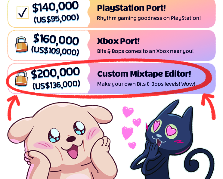 Our final stretch goal is a CUSTOM MIXTAPE EDITOR! If we reach this goal, you'll be able to build your own Bits & Bops levels and share them with your friends!