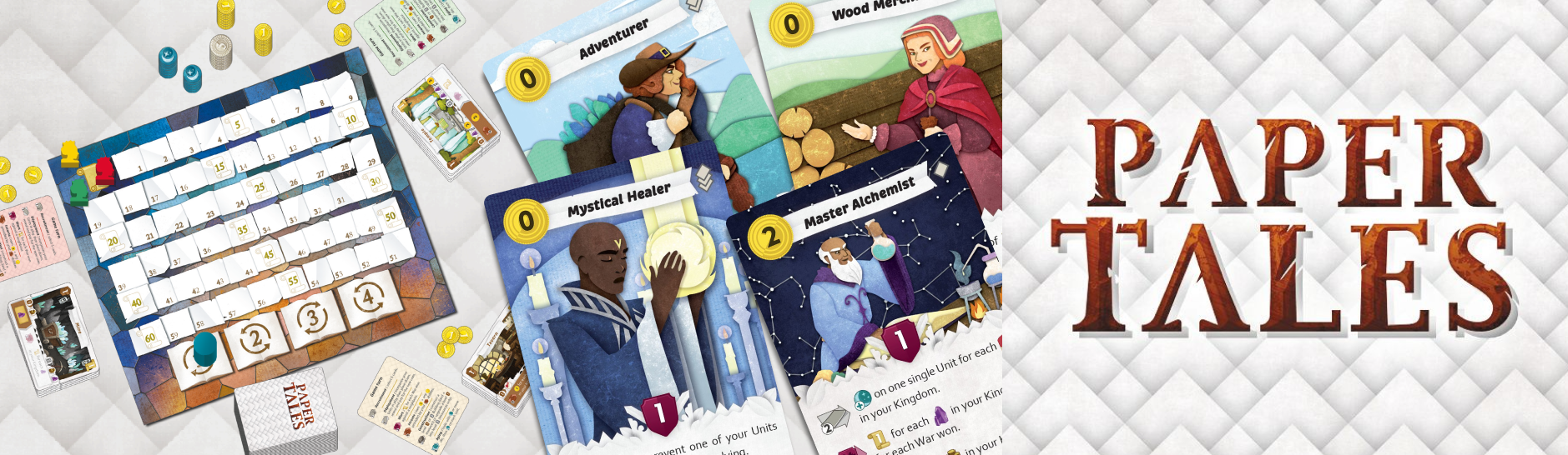 In more detail, Paper Tales is a simultaneous drafting card game. Each turn, players draft five units that they then recruit into their kingdom — assuming that they can pay. These choices determine the players' ability to shine in battle, generate great income, construct dominant buildings, and earn legend points. There are only four hiring positions available during the four rounds of the play, but your units grow older with each turn until time takes them away.