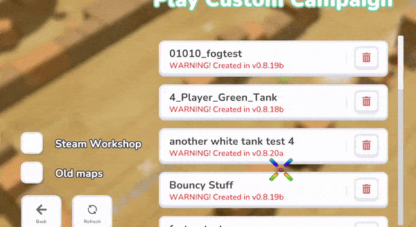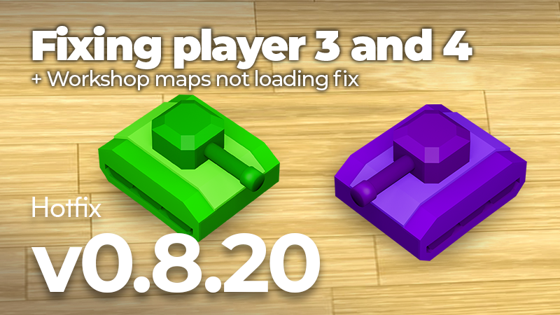 Changelog: - Changed how map borders, floor types, and weather stuff are stored (more efficient), so if you notice anything weird with loading/playing a map, please report it - Fixed artboard becoming unusable on low graphics - Fixed old maps are shown at bottom of the map list - No more mass error spam - Debris from explosions doesn't change to brown tank when falling on the floor - Player 3 and 4 , should not blow up anymore