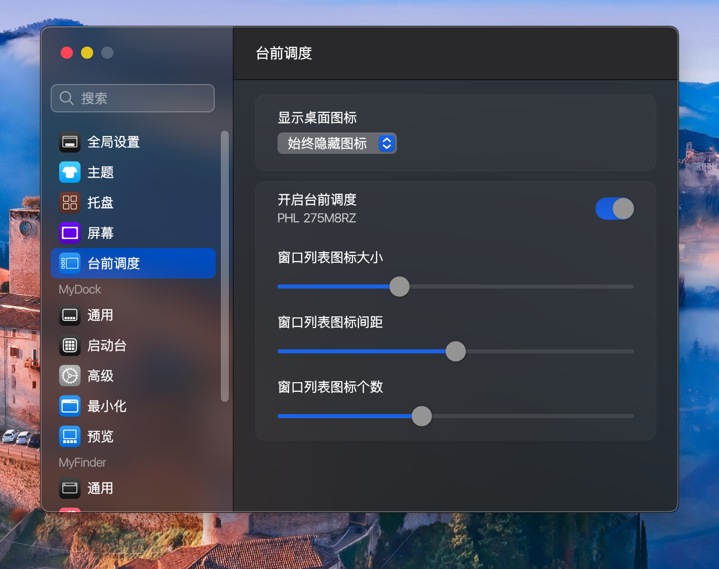 Preferences add pre-stage scheduling settings, you can choose to display and hide desktop icons, you can adjust the size, spacing and number of front-stage scheduling window icons, you can save the configuration after enabling pre-stage scheduling in preferences, and you can directly restart the program next time Enable the pre-stage scheduling function