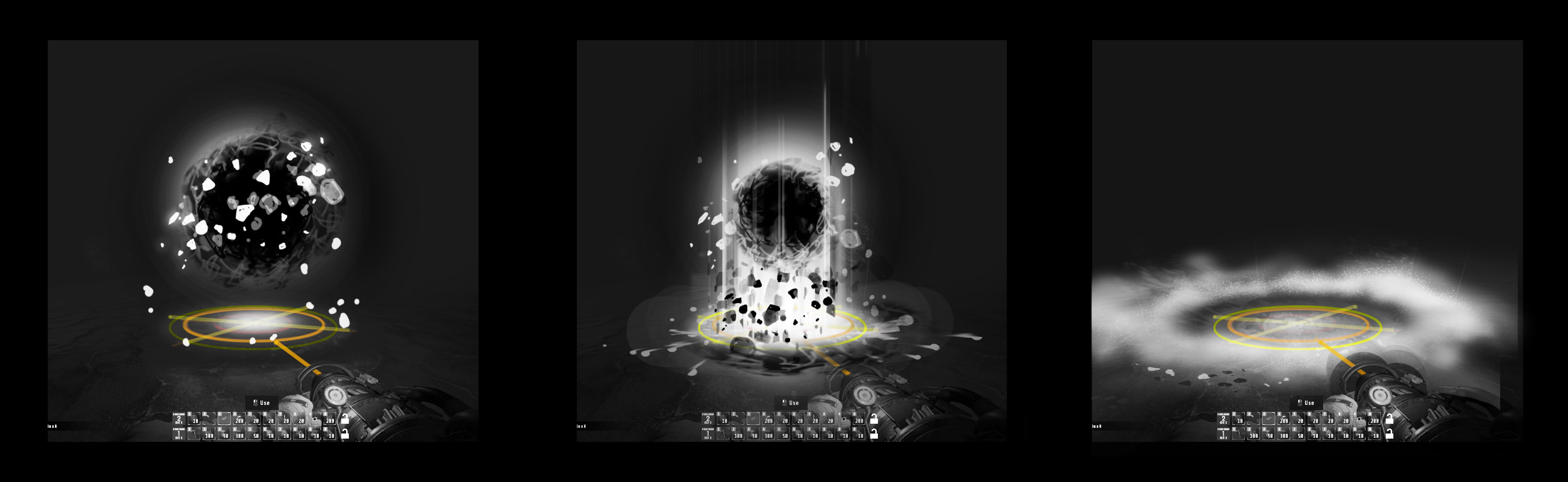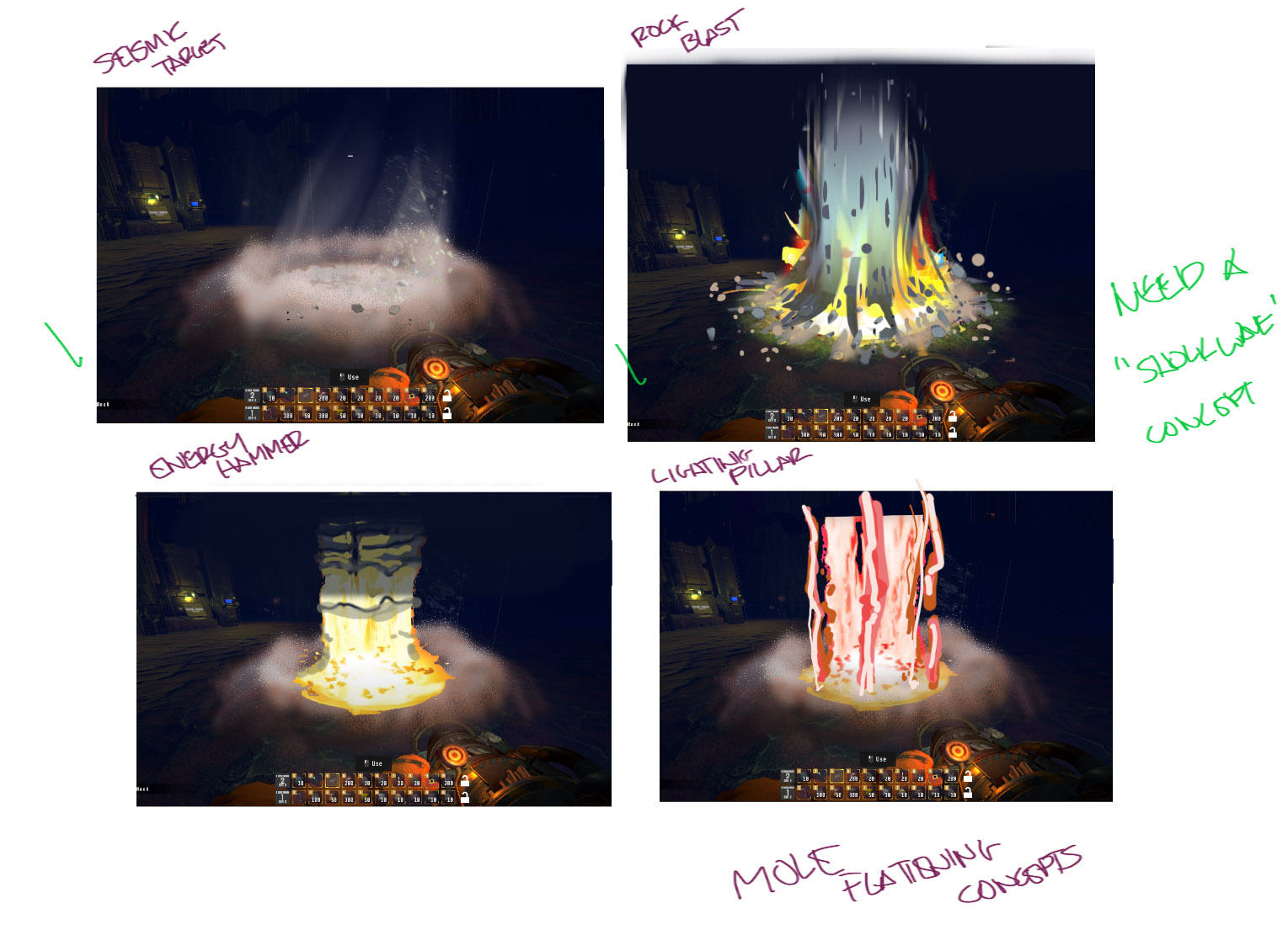 During the concept and design phase for Flatten Mode, we started kicking around five-ish unique ideas on how the M.O.L.E. should visually level space before landing on the hybrid final design. Four of those (informally referred to as the Seismic Target, Rock Blast, Energy Hammer, and Lightning Pillar) were sketched and considered.