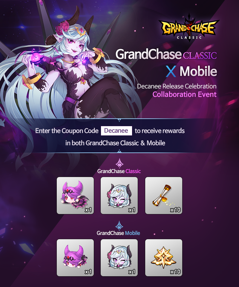 - Decanee Release Celebration Collaboration Event - Enter the Coupon Code 'Decanee' to receive rewards in both GrandChase Classic & Mobile - Go to GrandChase Mobile: https://moot.us/lounges/401/boards/1908/posts/5462049