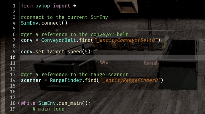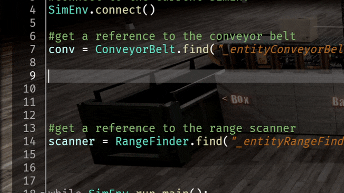 Autocompletion / Code Hints Maybe the most powerful feature of a good IDE is code completion. Essentially providing a list of possible tokens while you are typing. Using the power of the underlying mypy linter and it's type inference, the code editor provides you with context sensitive completion hints. So for example, if you type a dot "." after a variable pointing to a conveyor belt, you will see all member methods of the conveyor belt class.