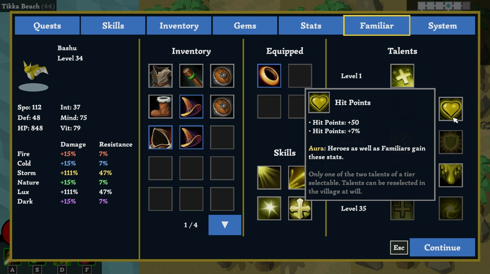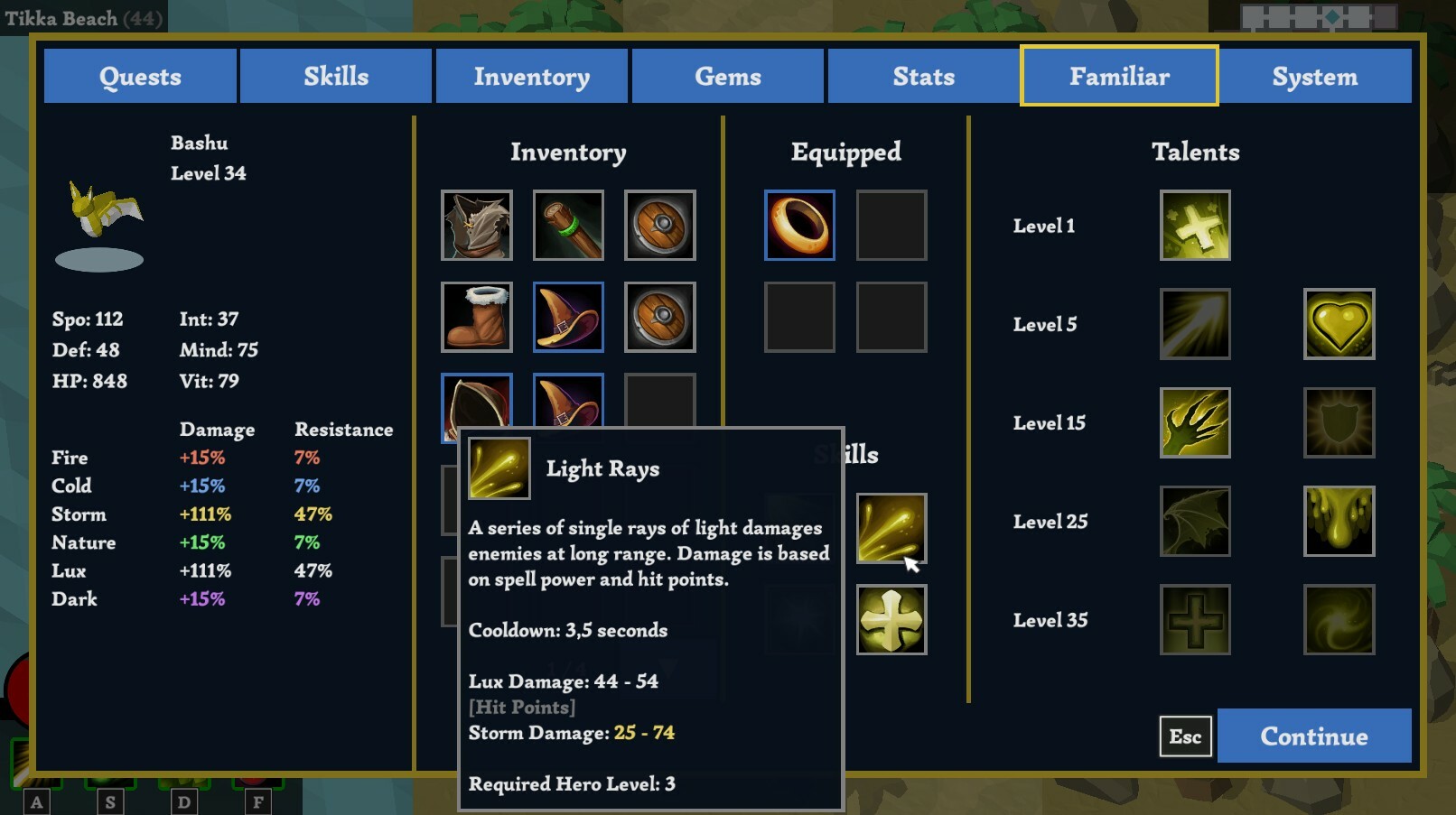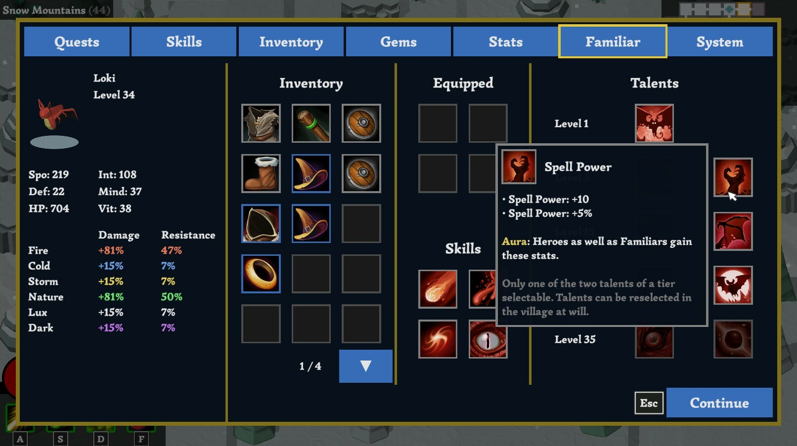 The first two available Familiars are Loki and Bashu. Loki uses high damage ranged spells (fire and nature element). The active skill "Heat Nova" also reduces the resistances of all enemies hit.