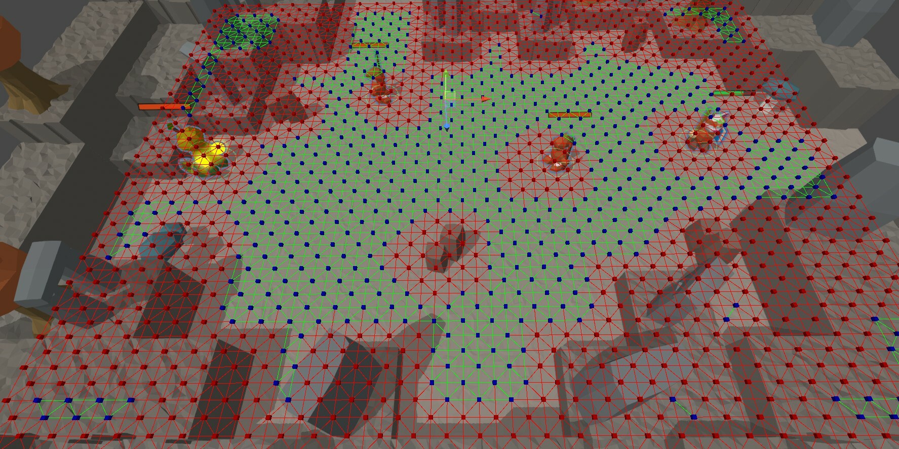 Kudos to Cory Koseck (7ark) for their Unity-Passfinding repo. I used that one as a starting point and adjusted it to my needs. The red nodes on the image above show blocked paths, the blue nodes with green connections show possible paths.