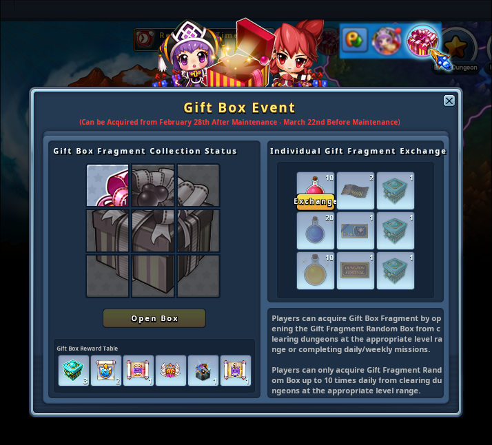 2-1) Complete a Gift Box - Gather 9 fragments to complete the Gift Box and press 'Open Box' to acquire the reward - Acquire 1 of the following: Single Property Scroll (Lv.85), Dungeon Entry Ticket Box, Premium GC Club (1 Day), GP Random Prop Scroll, Advanced Reinforcement Protection Scroll x2, Advanced Rune Summon Chest x3 - Players who 'Exchanged' Gift Fragments for rewards will need additional fragments to complete the Gift Box