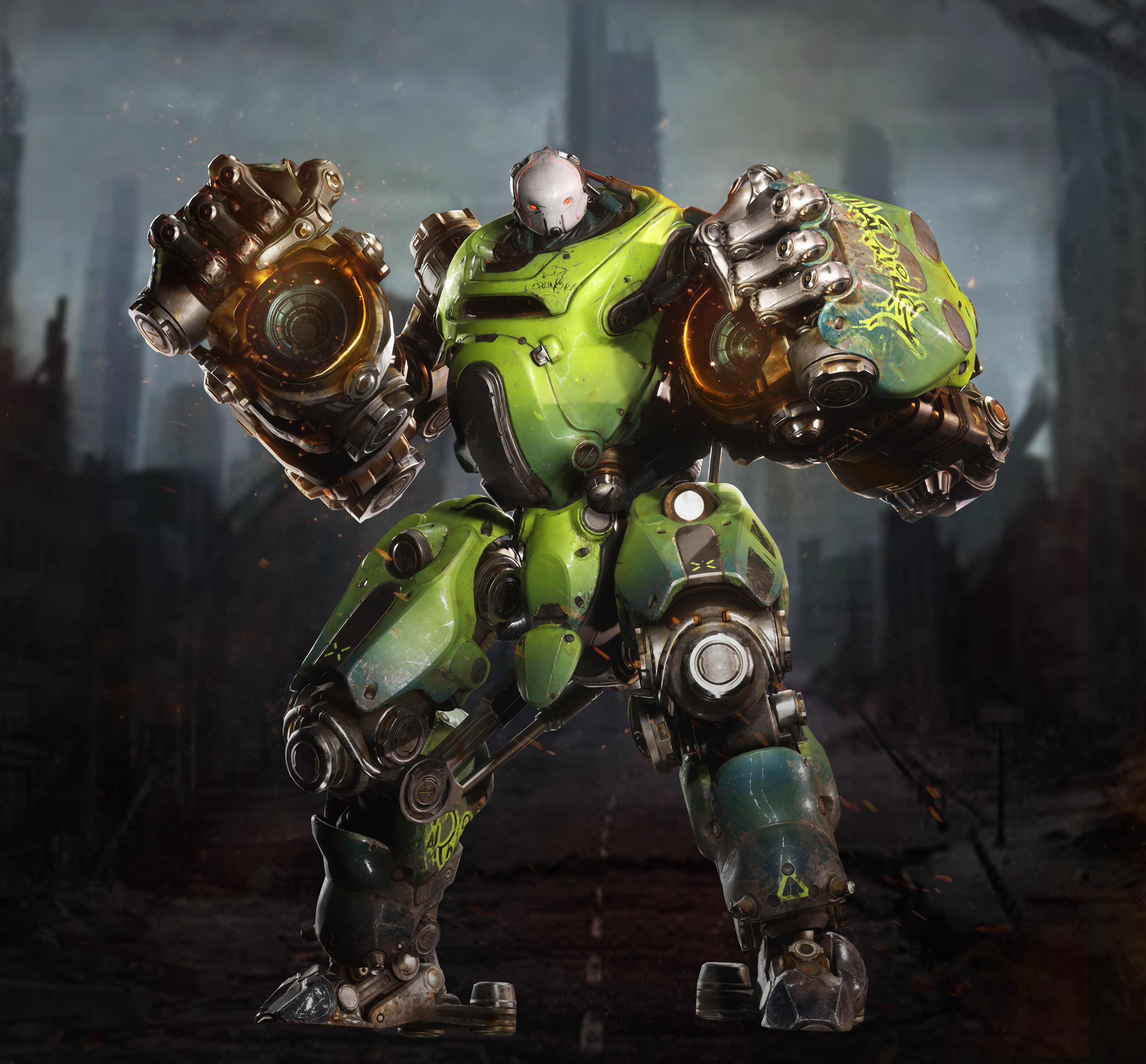 (The Fist of Justice) Crunch A private combat bot whose model was once insanely popular. He slowly gained sentience while sitting alone in an abandoned warehouse. Although Crunch looks outdated and worn, his AI contains a massive amount of combat data, granting him unmatched power in melee battles. Crunch came to the Prime Battlefield to find the reason why he has come to "life".
