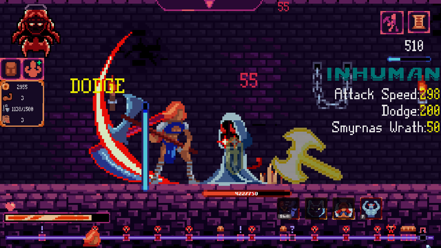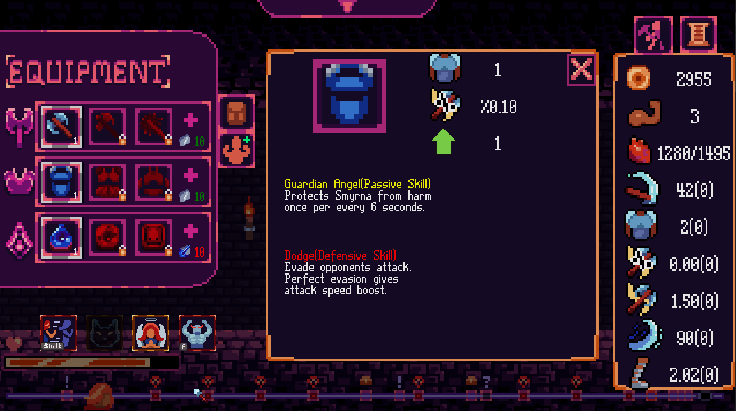 I completely changed the third tier equipment skills. Their old skills felt dull, but I think new skills are going to make things a lot more interesting and enjoyable. Though I still need to finish technical issues in mobile port and test those skills a lot more. Third tier equipment creates a high risk/reward playstyle by allowing Smyrna to gain lifesteal by sacrificing her health, while also gaining bonus damage based on her missing health. While these skills specifically complement each other, you can combine different tiers of equipment as you like.