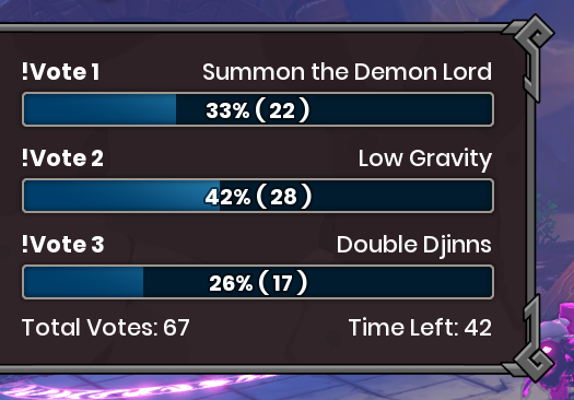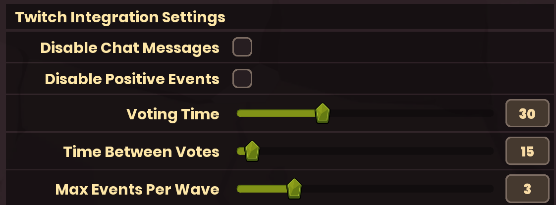 As many games have added, Twitch integration will allow streamers to link their Twitch account and have their chat vote on randomly chosen events to happen in-game. Events can be both negative and positive for the streamer and only happen in the combat phase. Streamers will also be able to configure the amount of voting time, time between events, number of events per wave and whether they want to disable positive events entirely. To use this feature, go to the Twitch tab on the options UI and fillout the info to link your Twitch account.