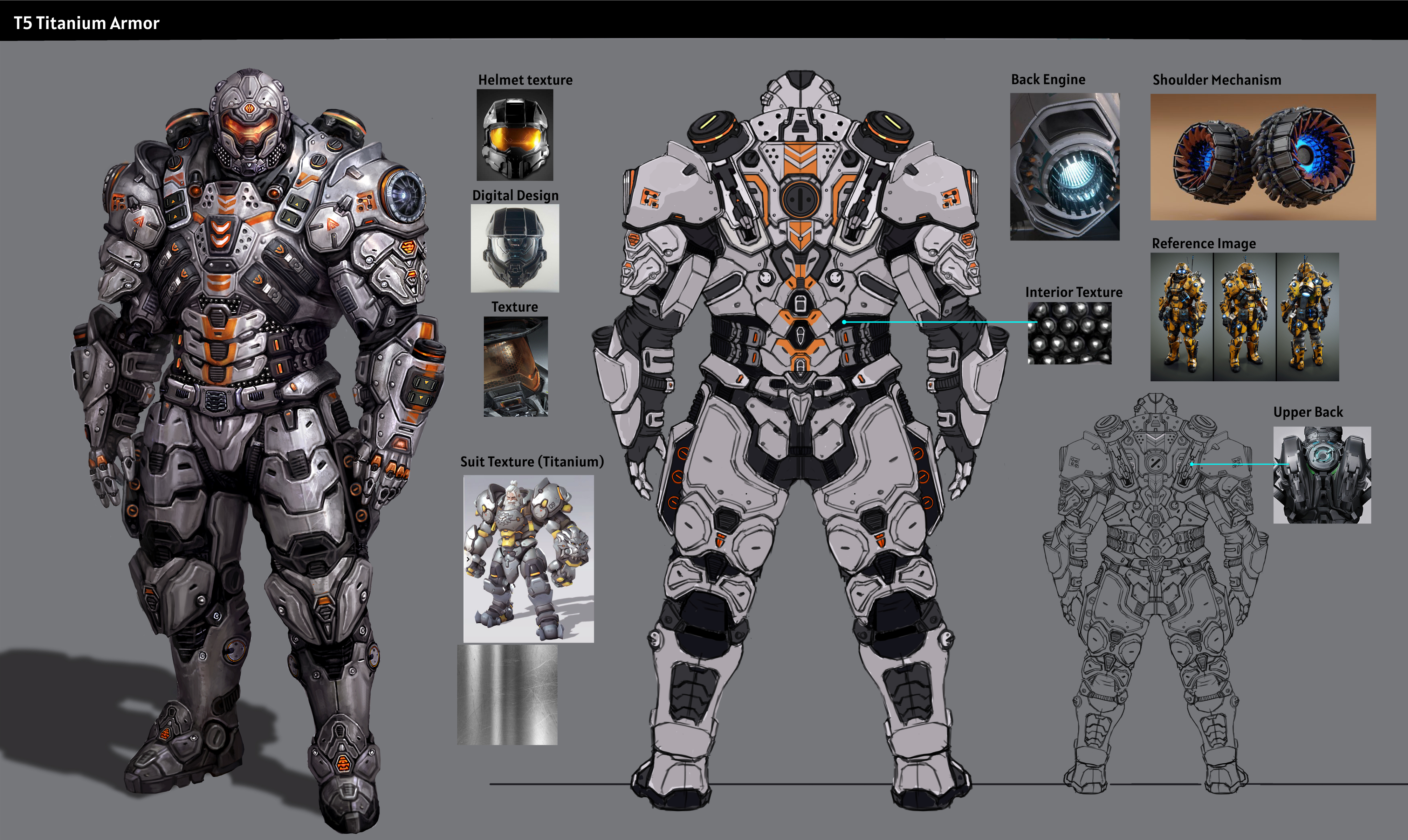 Here’s the design sheet for our (planned) Tier 5 titanium armor. Note: It will probably change quite a bit once we 3D model it.