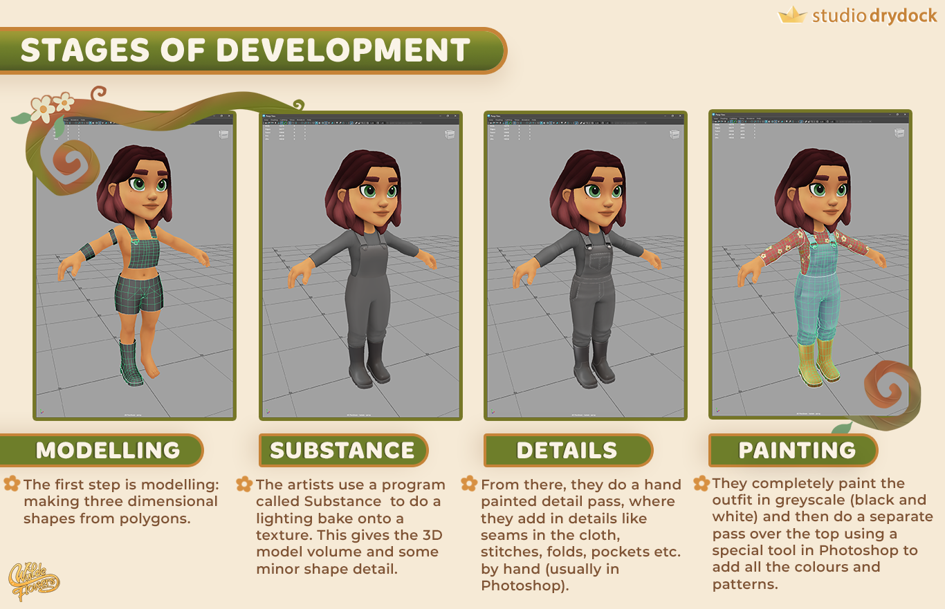 Audrey: What surprised you about the process of adding outfits? Iona: A few things, actually! It was surprising how much variety we ended up with through the use of colour. It’s also just a surprise seeing Tara in different clothes. At first it was a bit weird seeing her in different outfits, but I feel like they add so much personality to Tara, and the game as a whole! It’s now a delight seeing Tara in different clothes whenever someone in the team shares a screenshot. And, like always, I was surprised at just how amazing the outfits look once they were made in 3D (this happens every time and I shouldn’t be surprised anymore — Our 3D artists are magic!)