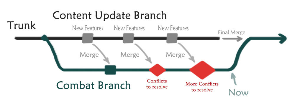 In order to maximize the team production effectiveness, we split our workflow into two branches - The Rise of the Dark Fog (combat system) branch and existing content updates. So that we can do these two parts of work at the same time, and keep the combat system info confidential. But we need to make sure to merge the changes made in the Update Branch into the Combat Branch from time to time, to ensure that the work on both sides is always in sync.