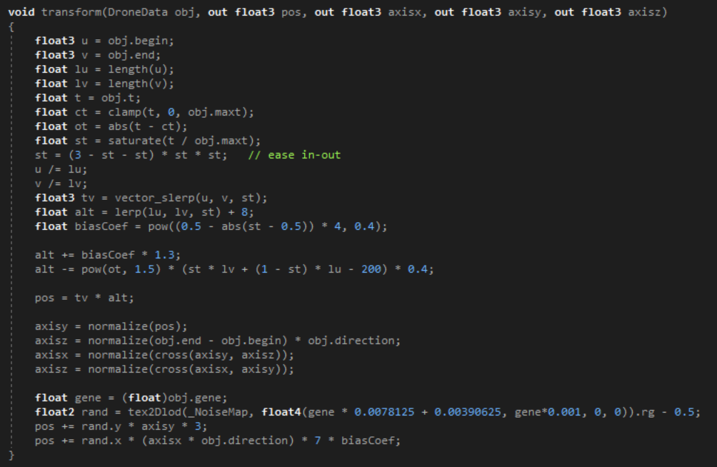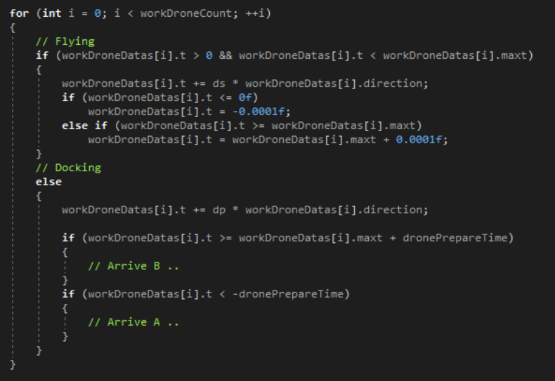 Well, in this case, We will have to take our BIG MOVE: using GPU to process some computations. Just like the optimization of Logistics Drones, CPU doesn’t have to calculate the curve that transports aircraft go through from point A (xA, yA, zA) to point B (xB, yB, zB) to unload cargo, or the process of body rotation, ascent and descend, how the tail flame effects change, etc. All CPU has to do is just add up a “t” value.