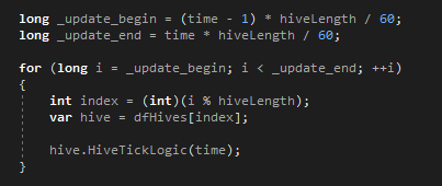 After consideration, we set the Dark Fog nest’s update logic to once every 60 logic frames, and all nest updates are evenly distributed across each frame as much as possible to avoid updating too much logic in one frame. For example, if a player chooses the 60-Star startup build, then each logic frame will update one planetary system’s Dark Fog nests in turn. The following are some simple load-balancing codes: