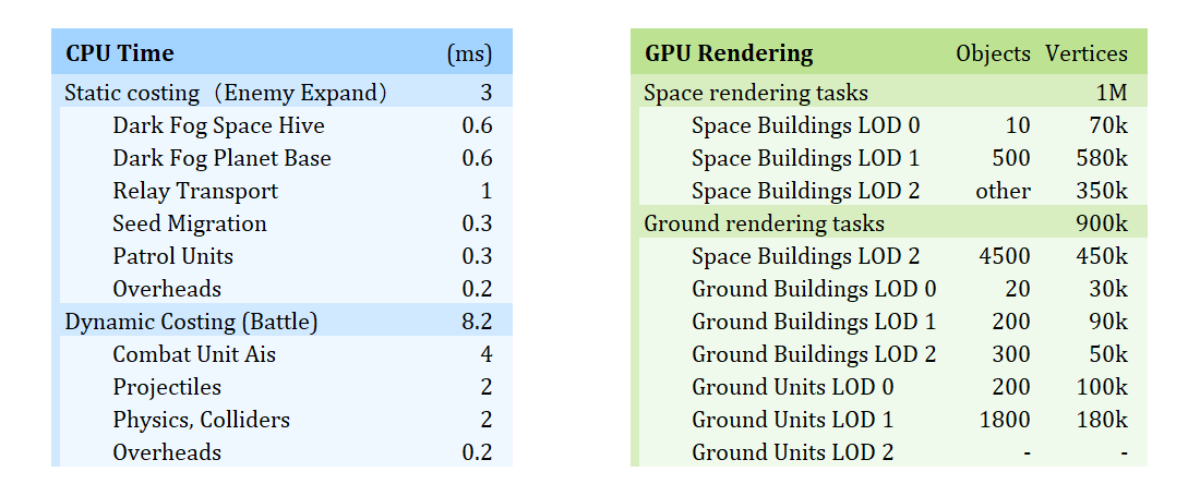 We know that if the Dark Fog takes up the player’s development space (and CPU computing resources), the player will want to destroy it. So the activity of the Dark Fog and the player’s factories are roughly inversely proportional, and we used it to set the following performance optimization goals: