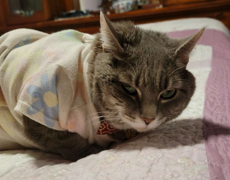 See you next week--enjoy the last image of Marketing Assistant Cami, who recently escaped the Shirt of Doom following a little surgery. (She is fine, just cranky.)