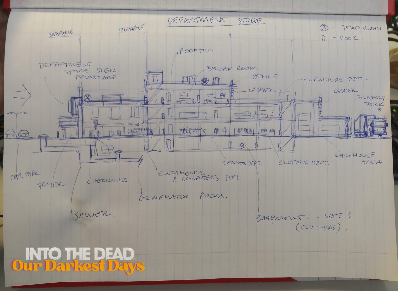 Something that I stumbled across recently were these physical level design sketches by our Principal Artist E'van Johnston, which I loved so I wanted to share with you all. Obviously a lot of our work is done digitally these days and for the most part that's the world we inhabit, but it's always nice to see things getting a little acoustic every now and again.