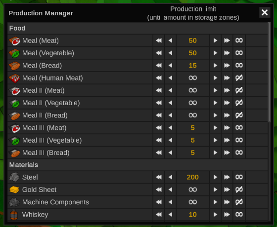 In the new menu you have an overview of all items that can be produced and can set the corresponding limits there. The limits apply to the number of items in all your storage zones.