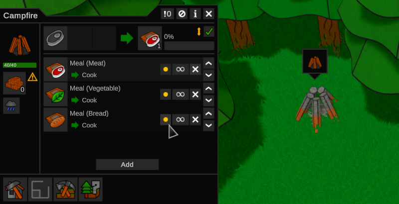 For example, if you have the meal (meat) production limit set to 10 and you have a campfire (or more campfires) with a meal (meat) job with infinite, your colonists will discard that job if there are more than 10 Meals in your storage zones.