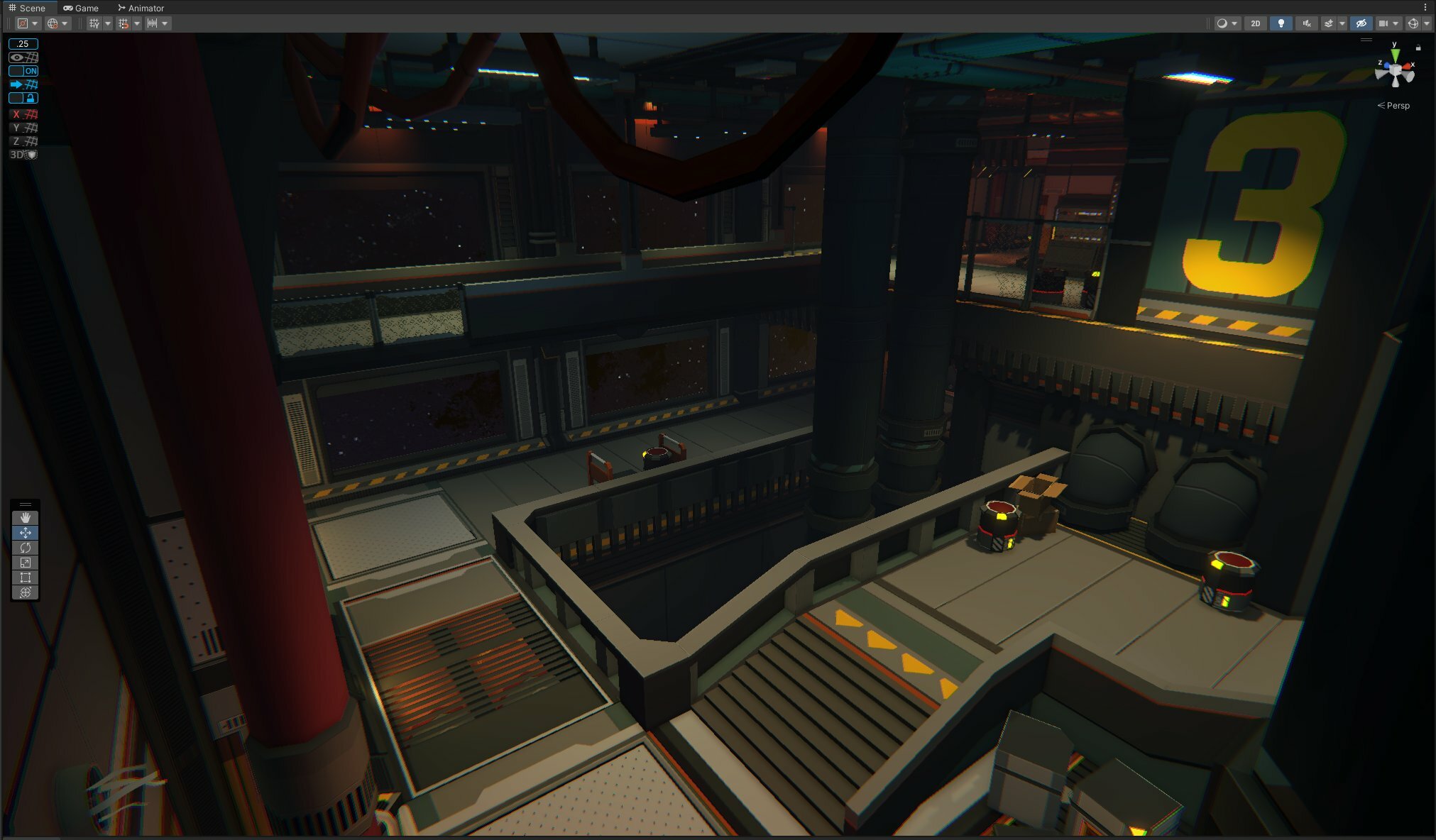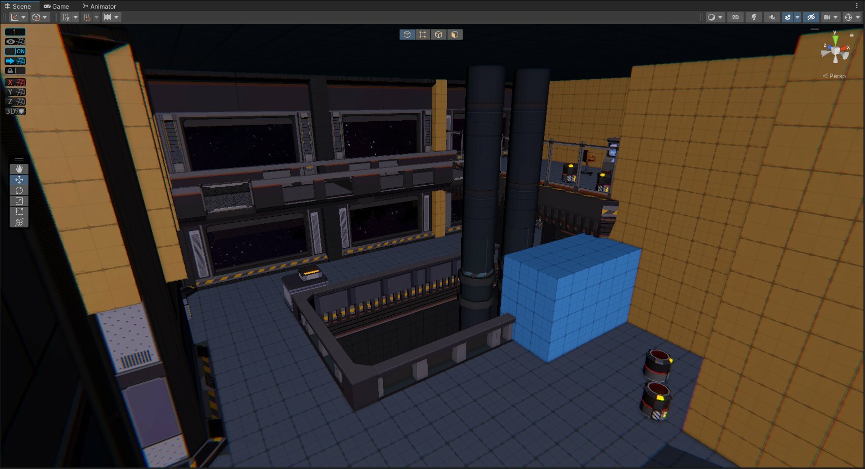 We felt like a new level with a lot of windows would be a good thing for demo-players to enjoy, so we created "Fuel Exchange". Here is an in-editor work-in-progress shot: